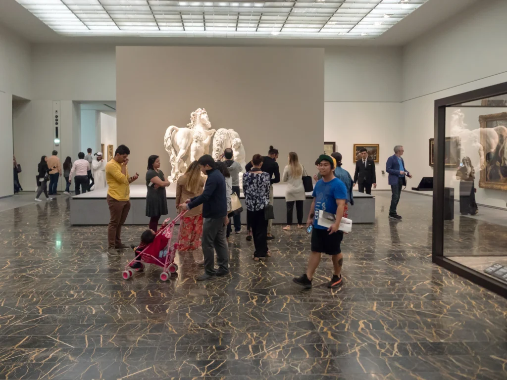 Vast exhibition halls display world-famous artworks and sculptures from multiple historical eras.